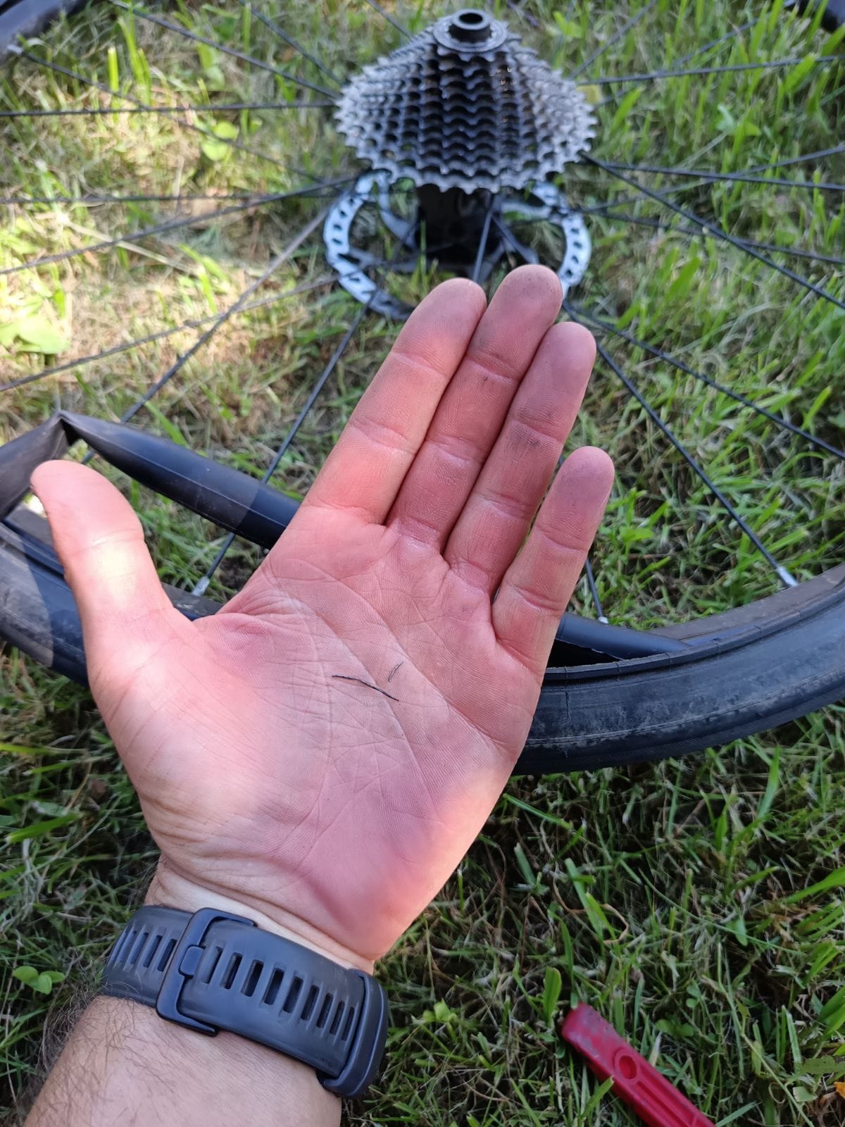 És jött a meglepetés, eszemet nem tudom mióta, defekt! Iszonyato ritkán kapok likat, nem is emlékszem rá mikor volt legutóbb (lehet ahhoz többet kéne tekerni btw) mindenesetre ez kicsit váratlan volt. Lejtőn lefelé harminc körüli tempó, tüköraszfalt, és kb 4 másodperc nullára kifújt, egy apró vékony drótdarab miatt. Újat kivesz-betesz- tovább!