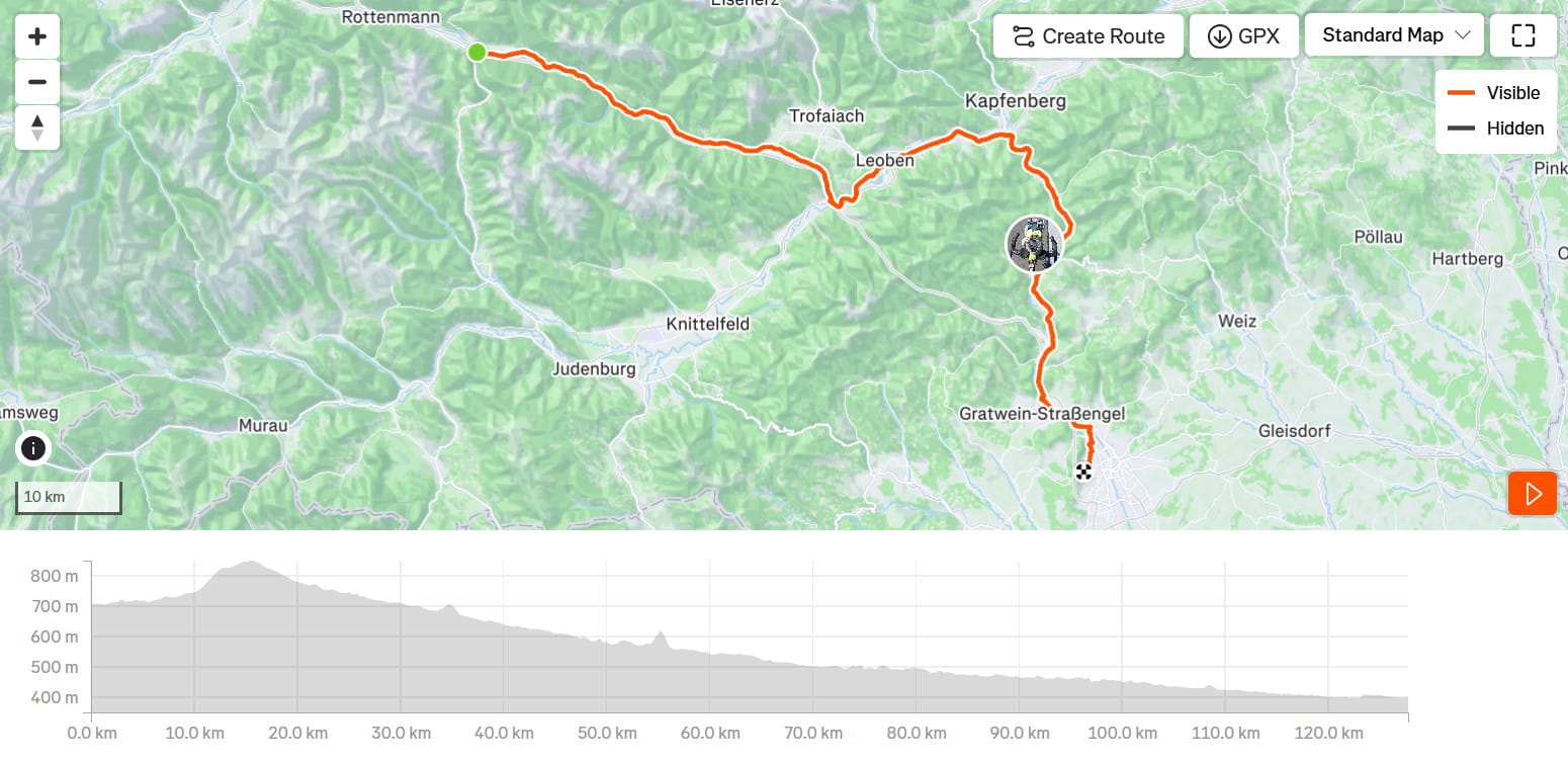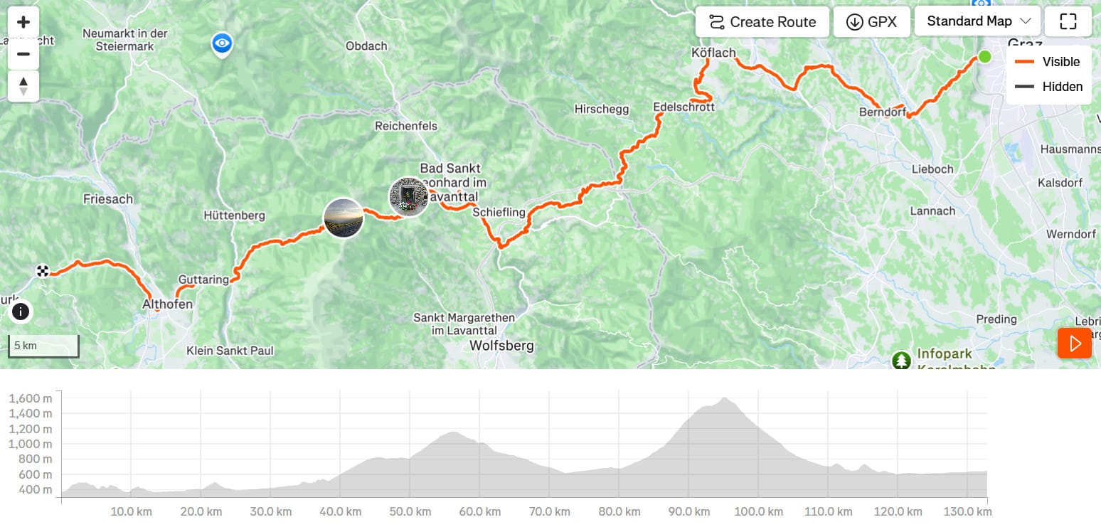 Csomagostul azért volt egy-egy 23% ami kicsit arconvágott, de jó az a grx, túrázni nagyon is jó az az áttétel. Liezen után lett egyre lazább a dolog, ahol már a Mura felé folyásiránynak megfelelően lehetett hasítani, így estefelé kicsit visszakaptam a délelőtt elvesztett távokat. Szállás, vacsi. Kicsit sétáltam is a városban, korábban megálltam mivel az utolsó napra már jó terep és egész kevés kilométer várt.